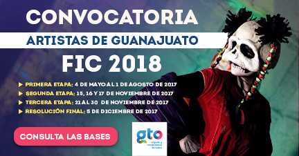 El Gobierno del Estado, a través del Instituto Estatal del a Cultura, el Ayuntamiento, el Forum Cultural Guanajuato, la Universidad de Guanajuato y el Instituto Cultural de León convocan a los artistas a participar en el proceso de selección de la XLVI edición del Festival Internacional Cervantino (FIC) a desarrollarse en 2018.
